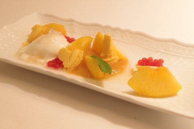 ■山形県産の黄金桃フレッシュとピューレ ヨーグルトのソルベ、ジャスミンティーのグラニテを添えて