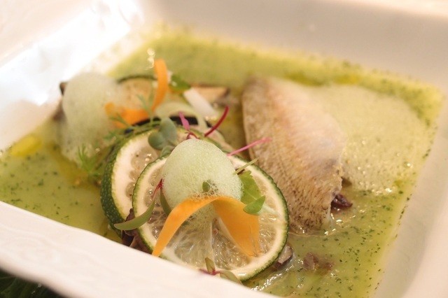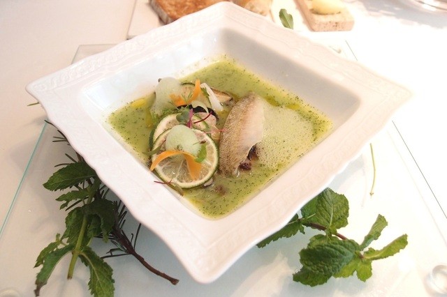 Jun ,2014 オコゼのポワレ 新玉葱と蕪のブイヨン仕立て ピペラードを添えて