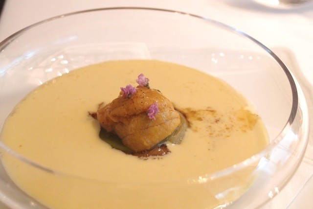 ■雲丹と山梨県より朝露と共に収穫したトウモロコシの冷たいスープと焼き茄子