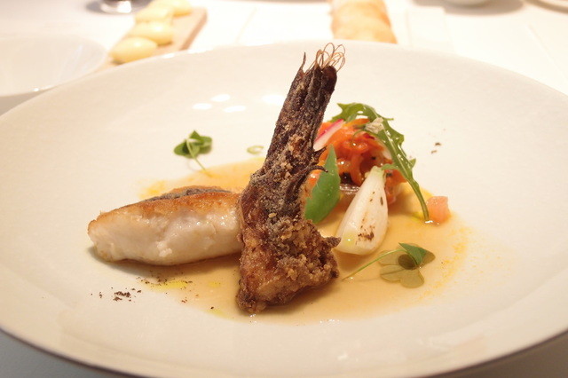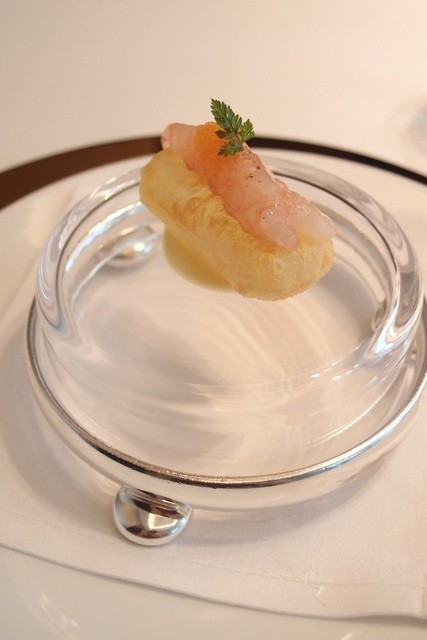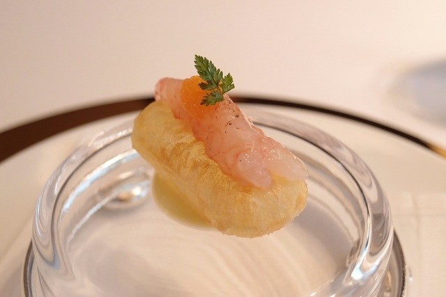 Jun ,2014 カリカリのじゃがいもで包んだ赤座海老 大葉風味の茄子のマリネ