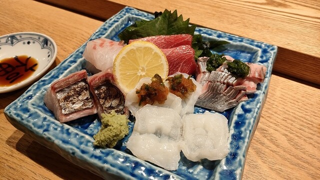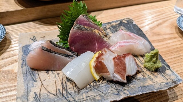 刺身は平アジ、太刀魚炙り、真ダコ、しめ鯖、鰹たたき