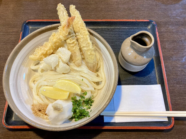 コシの強い艶々のうどんに揚げたての天ぷら(海老、もち、ごぼう)。