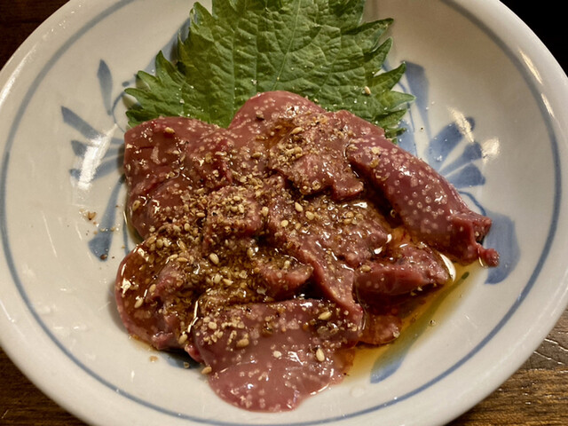 バーナーで表面を炙った、厚切りの牛ハツの刺身。