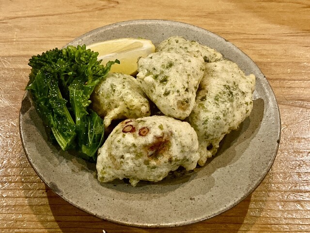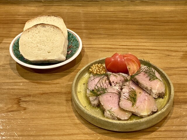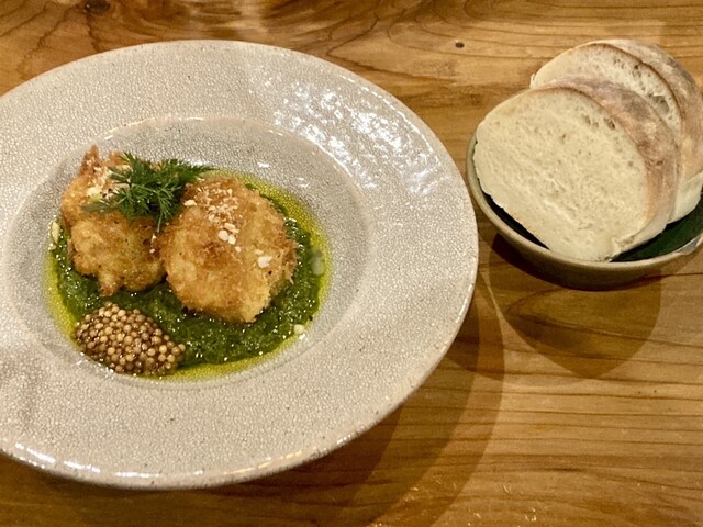 タコと若松トマトのジェノベーゼと牡蠣バター最中。