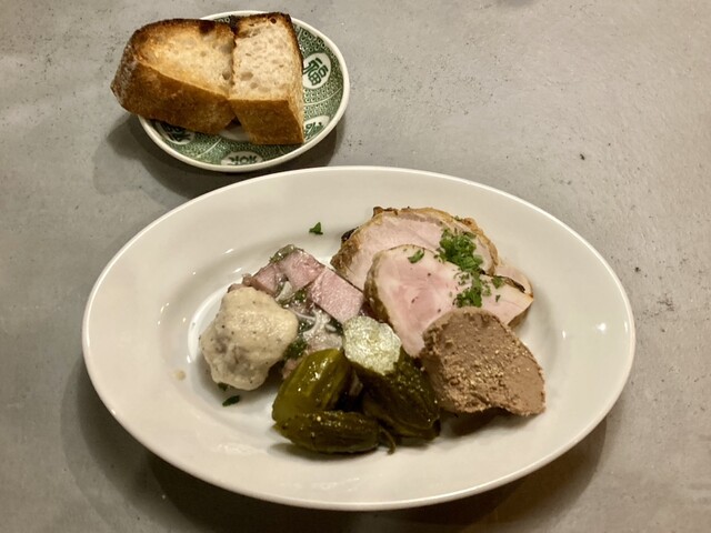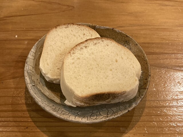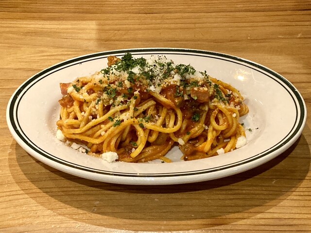 ベーコンとハラペーニョのパスタと自家製イタリアパン、ギオット。