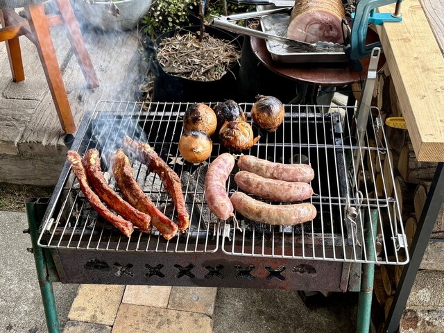 YOURTEの恵方巻を販売しつつ、店先では黒豚サルシッチャ、ポルケッタ、スペアリブの炭火BBQ販売。