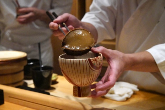 立派な煮鮑、握りかな?とわくわくしていると細かく切り始め、なぜに…?と思っていたら茶わん蒸しに、ごはん・柔らかく煮た鮑・肝と海苔あんかけにしたお店のシグネチャー「茶碗蒸し」を最後に添えたわさびがよきアクセントとなってこの日の中で1番記憶に残りました。