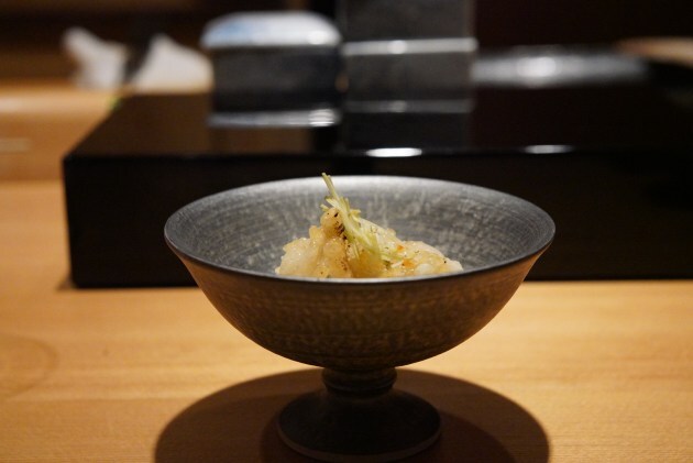 最初のおつまみは、年に1ヶ月ほどしか出回らないという「ビワマス」脂のバランスがとてもよく、仕事がされていておいしい。江戸前の鮨はこの手仕事がお店事に異なり、毎回楽しみ。薬味を変えて色々愉しめる工夫も素晴らしい。