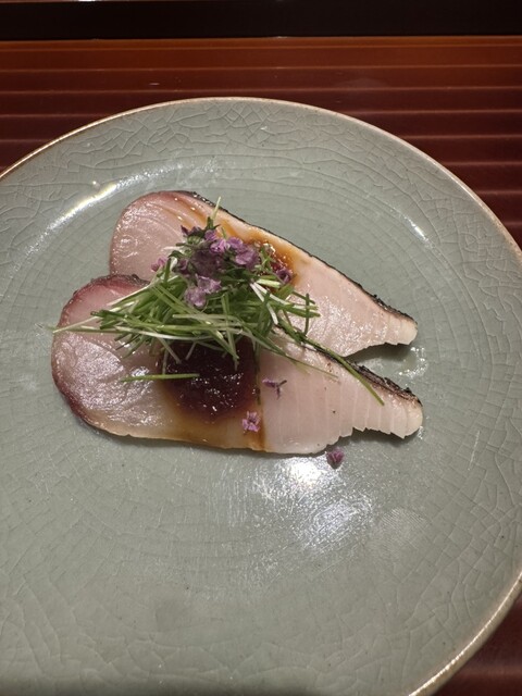 お次はサワラの藁焼きです。サワラの身が引き締まっていることに加えて、玉ねぎ醤油と芽ネギのさっぱりコンビのお陰で飽きずに食べられます。好き。