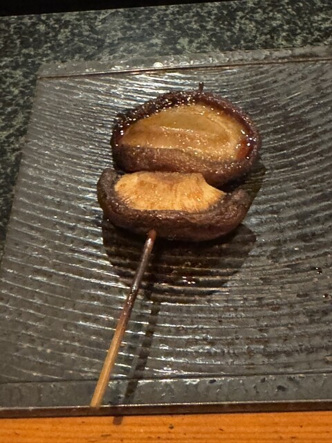 写真だと何だかよくわかりせんが、お次はナスです。当店、冒頭で野菜の串を選べます。串焼きが8本出る前提で、そこから選んだ野菜串の数だけ焼き鳥の数が減ります。私と連れはナスとシイタケを選択したため、焼き鳥は6本ということになります。