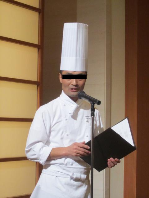 ①祝宴に際して、総料理長が参加者に対して全ての料理の解説、それに合うワイン等を冒頭に紹介してくれる。