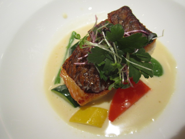Seared sea bream,served with colorful vegetables,clam jus and virgin olive oil emulsion