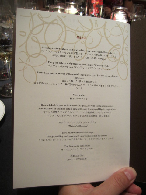 このチャリティキャンペーンは、ロビーに飾るペニンシュラクリスマスツリーに彩るオーナメントをチャリティーし、その売上を難病と闘う子供たちの夢を叶える活動資金として役立てている。そんなクリスマスツリーがまぶしいロビーを眺めながら、祝宴に向かう。