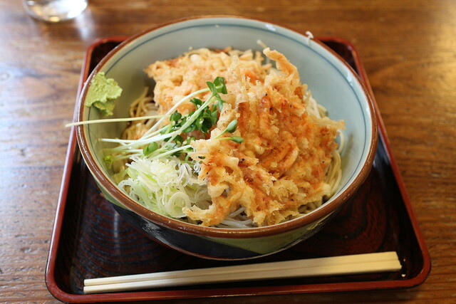 いつもは冬の名物「根せりと牡蠣そば」を楽しみにしているが、暑い日ゆえ相方が「舞茸天せいろ」、私は「冷やしたぬきそば」を注文し泡で喉を潤す。壁にびっしりと貼られたお品書きを見ていると着丼。