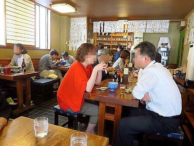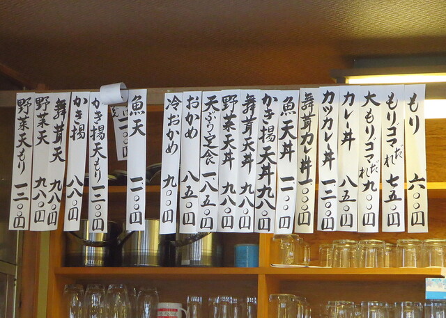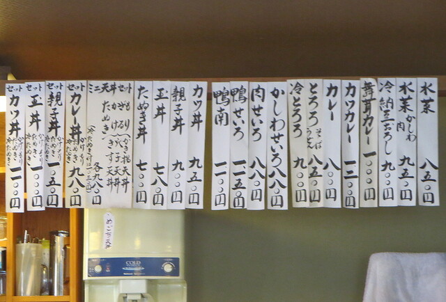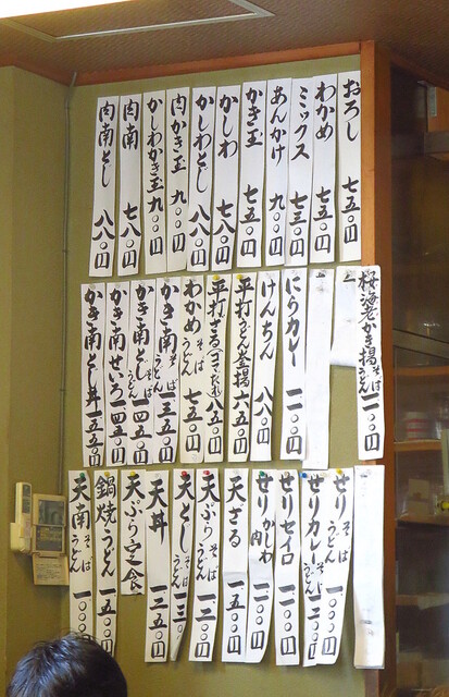 店舗は1階と2階に分かれている。狭い階段を昇り2階に上がると、壁一面に豊富なお品書きの札に先ずは驚かされる。昼は周辺のサラリーマンやOLに。夜は蕎麦屋の摘みを楽しみに親爺達の社交場となる。