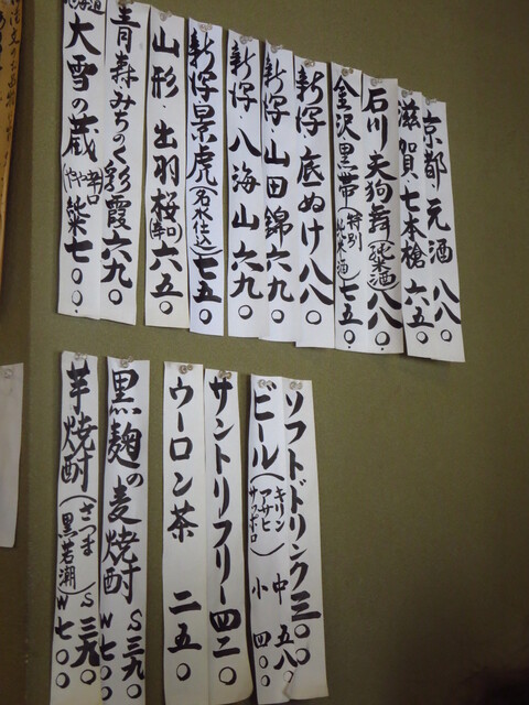 資料によれば創業は1950年(昭和25年)前後。戦後間もない時だろうか?店内は歴史を感じる飴褐色に黒光りする卓、常連客のわがままを聞いているうちに増えてしまったという”お品書き”が、壁一面を埋め尽くす。