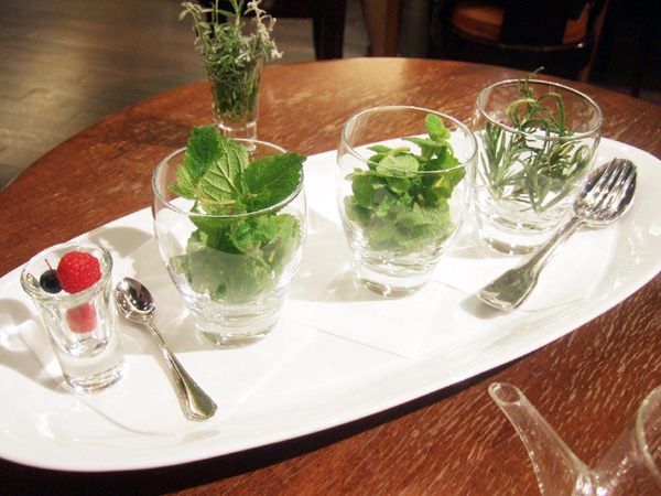 値段的にかなりの価格ですが、3種類のハーブがそれぞれグラスに入ったとってもかわいらしいプレートが供されました。