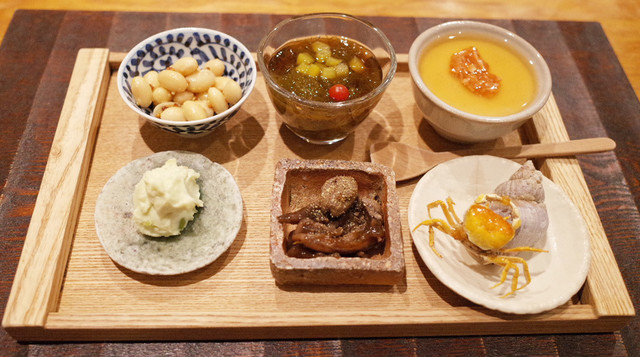 ・前菜は稚鮎の南蛮漬け、増田牛を炊いたもの、すっぽんの肝