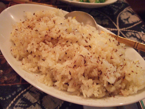グリーンピースたっぷりのマタルプラウ(400円)、クミンたっぷりのジラライス(400円)、それぞれ特色のある2種のごはんも美味しいです。
