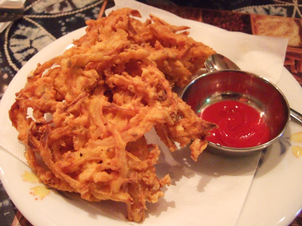 お通し?のパパド(豆せんべい)を美味しくいただきつつ、たまねぎをスパイスで揚げたオニオンバジャ(480円)、チーズと野菜の鉄板焼きのパニール・サスリク(890円)を。