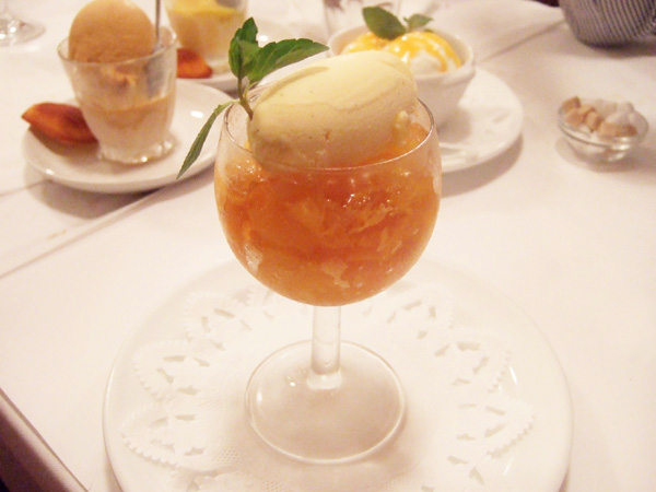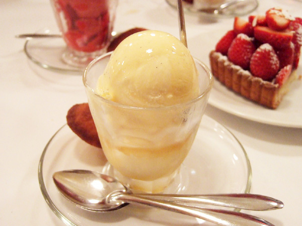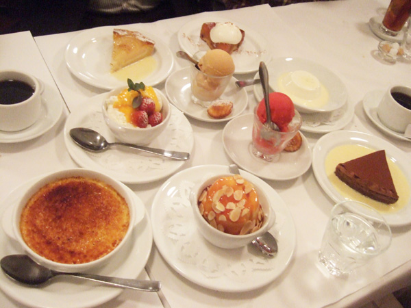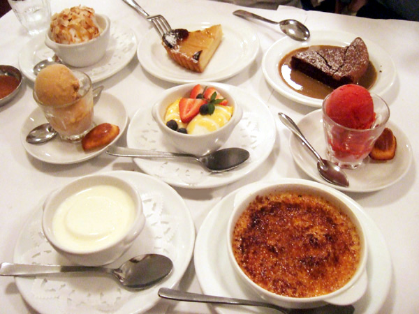 洋梨のタルト、ココナッツ風味のブランマンジェ、イル・フロタント、フロマージュブランのムース、フランボワーズのシャーベット、キャラメルのアイスクリーム、フォンダンショコラ、クレームブリュレ