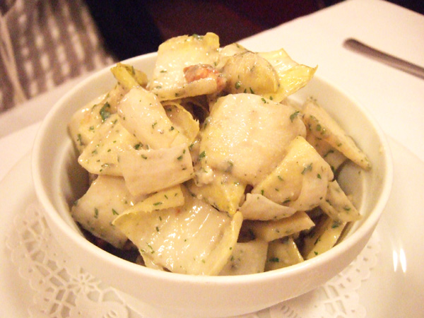 「アンディーヴとリンゴ、クルミとロックフォールチーズのサラダ」は名前だけではさっぱりサラダの印象を受けますが(私だけかもしれない…)、ブルーチーズがかなりきいているの濃厚なサラダです。私は好きな味ですが、かなりクセが強いので好き嫌いが分かれるかもしれません。