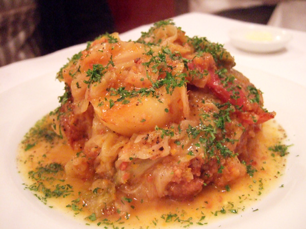 「豚肩ロースとキャベツのブレゼ」はたっぷりのキャベツに大きなベーコン…これまた本体に行き着くまでにかなりの時間を要します。