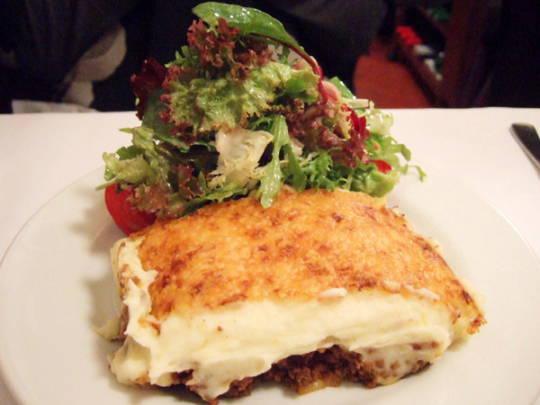 アッシパルマンティエ サラダ添え(鹿ひき肉とマッシュポテトとチーズの重ねオーヴン焼き)