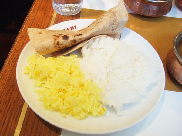 サザンスパイス、スパイスカフェ、デリーのコラボフルコース(3500円)の日本米(石川県産コシヒカリ)、インドバスマティ米のサフランライス、全粒粉のうす焼き種なしパン