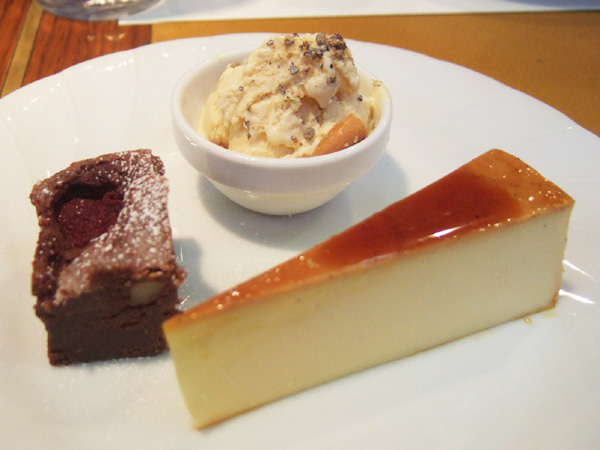 ・プリン、チョコレートケーキ、ハチミツのジェラート