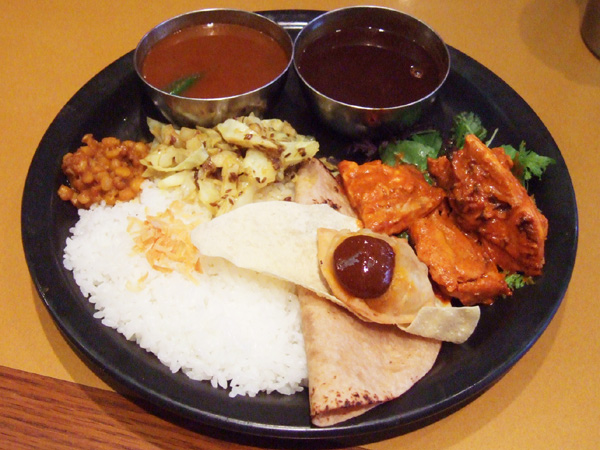 内訳はお好みのカレー2種、サモサ、チャパティ、タンドーリチキン、サブジ、ライス、お好みのソフトドリンクといった感じです。