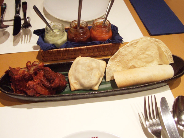 オードブル4品盛り合せ(1050円) パパド、サモサ、スペアリブ、マサラドサ。