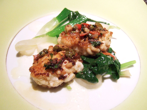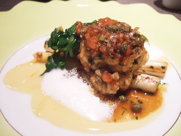 根室産白子のムニエルとロワール産ホワイトアスパラガス 酸味をきかせたトマトとケッパーの焦がしバターソース(+800円)