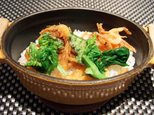 海老のフリットと菜の花のブルゴーニュバターの鉄鍋炊きあげご飯