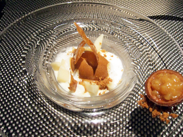 デザートはキャラメルスフレとマロンパイを諦めて、ルレクチェ、クレーム、パフェ、ゲレンデの4種類。プティフールの生キャラメルまで。