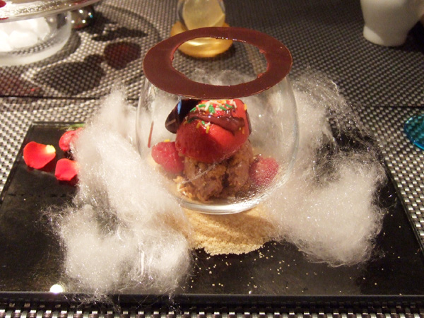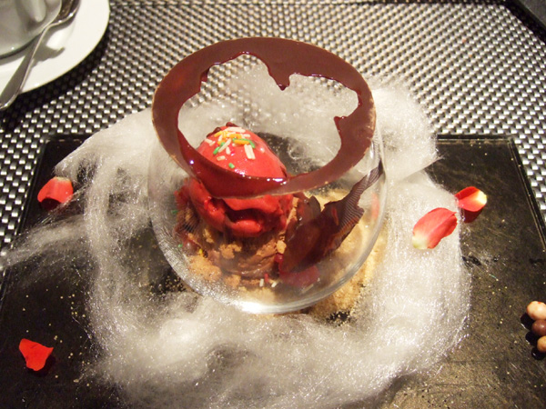 薔薇の香りを閉じ込めたフランボワーズとショコラの球体のパフェ