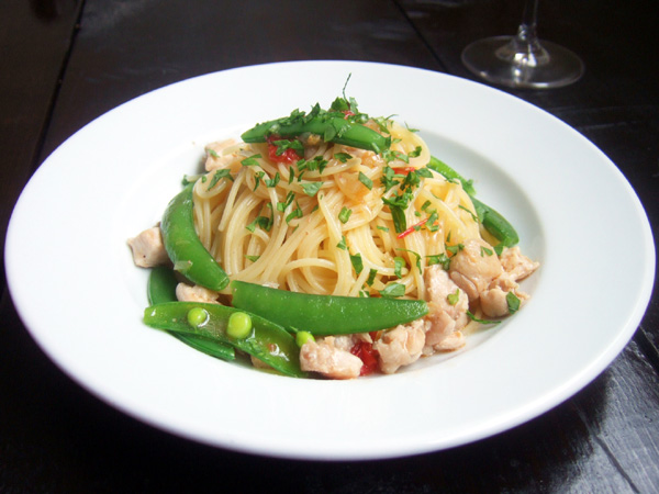 鶏肉とさやえんどうのシンプルなパスタ。とっても美味しい。