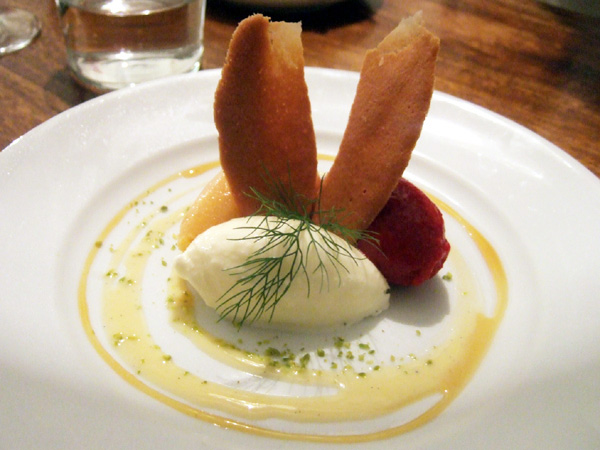 こけもものアイス、レンズ豆のお汁粉、梅に見立てたミラヴィルというフランスの果物と、とても春らしい色合いと香りが広がります。