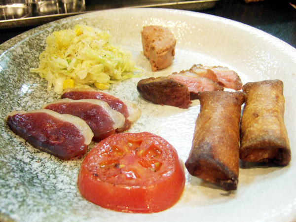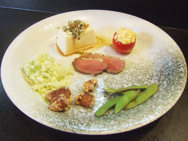 マグレドカナール(鴨)のロースト、四色薬味の冷や奴、フルーツトマトのダミ玉ファルシ、焼き枝豆、鶏皮の唐揚げ、コールスロー(6/30羊の会)