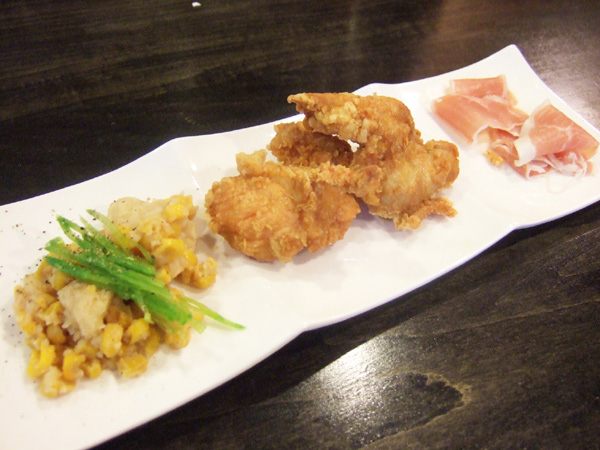 とうもろこしとじゃがいも、唐揚げ、生ハム(700円)
