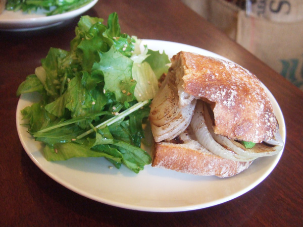 まずは季節野菜(この日は新たまねぎとスナップえんどう)のオーブン焼き バルサミコソースのサンドイッチをいただきます。