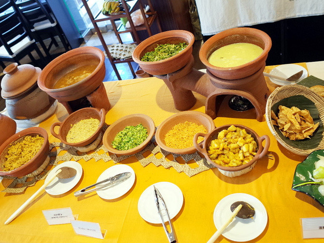 モーニングビュッフェではサラワナンシェフのチキンと豆のカレー、フレッシュジュース、野菜スープ、卵かけごはんなどがいただけます。