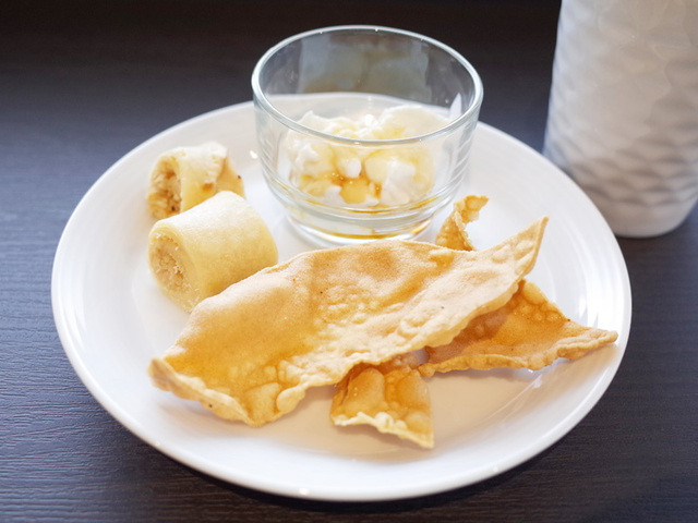 スリランカのデザート。スリランカのパンケーキ(ココナッツをクレープのようなもので巻いたお菓子)、ミーキリ(水牛のヨーグルト)、タピオカ、パイナップルの4種類
