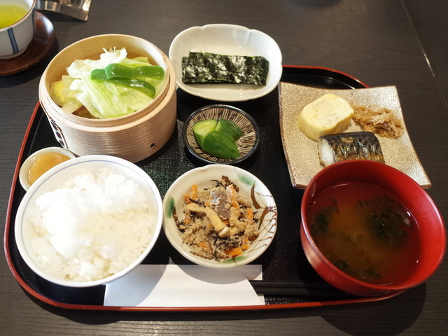 絶妙な炊き加減の白米、お味噌汁、日替わりおかず、焼き魚、温野菜(酢味噌つき)、なめたけ、玉子焼き、焼き海苔(絶品の田庄の海苔)、自家製の糠漬けといった朝定食です。