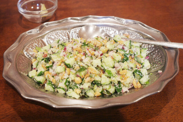 2015年の春のコース(4500円)のルッコラとアサリのカレー、竹の子の白ゴママサラ、ひよこ豆のスンダル、ドーサ、アルティッキとトマトチャツネ、マンゴードレッシングのサラダ