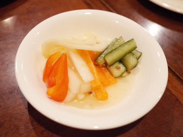 ディナーコース(2500円)の野菜の小皿:キャベツとコーンの炒め物