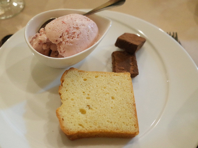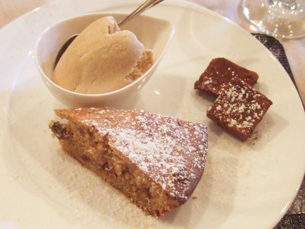 サンク・オ・ピエ ジビエ尽くしのコース2014(6800円)のイタリア産栗粉とアーモンド粉レーズンと胡桃のケーキ、生チョコ パヴェのコアントロー風味、さかもとこーひー"カフェ・エクル"のアイスクリーム