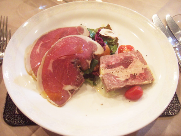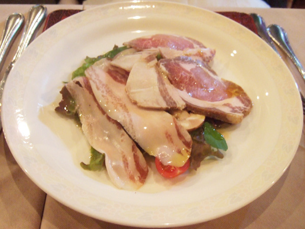 サンク・オ・ピエ4月5月のコース2014(5400円・外税)のパルマ産生ハム、ピオ・トジーニ社、サラダ添え