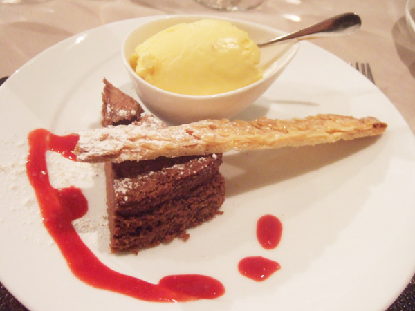 サンク・オ・ピエ13周年記念コース(12000円)のヴァローナ社の“マンジャリ”のガトー・ショコラ、フランボワーズのクーリを添えて、サフラン風味のアイスクリーム、アーモンドのフロランタン