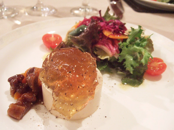 サンク・オ・ピエ13周年記念コース(12000円)のフォアグラのムース仕立て、ドライフルーツのコンポートとコンソメジュレ添え